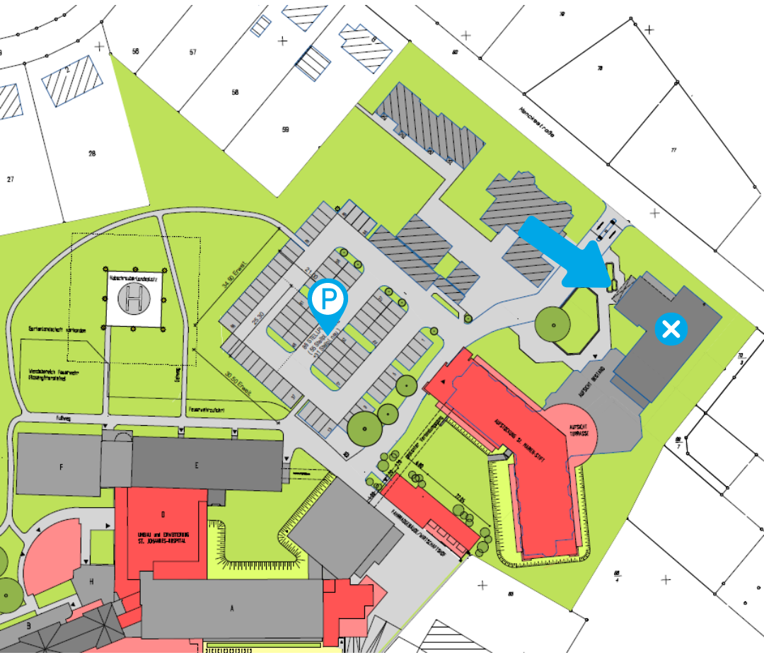 Einfahrt zum Parkplatz am St. Johannes-Hospital Varel befindet sich in der Menckestraße 4.